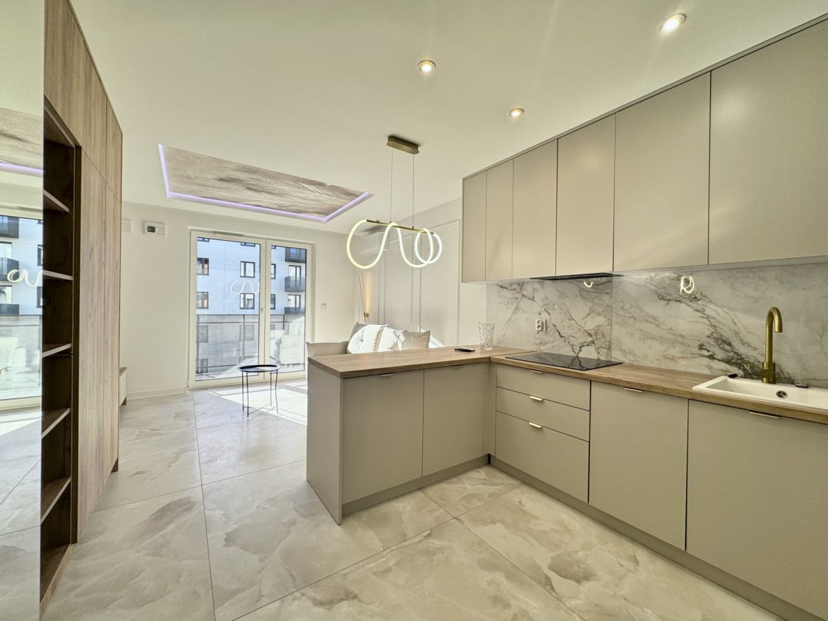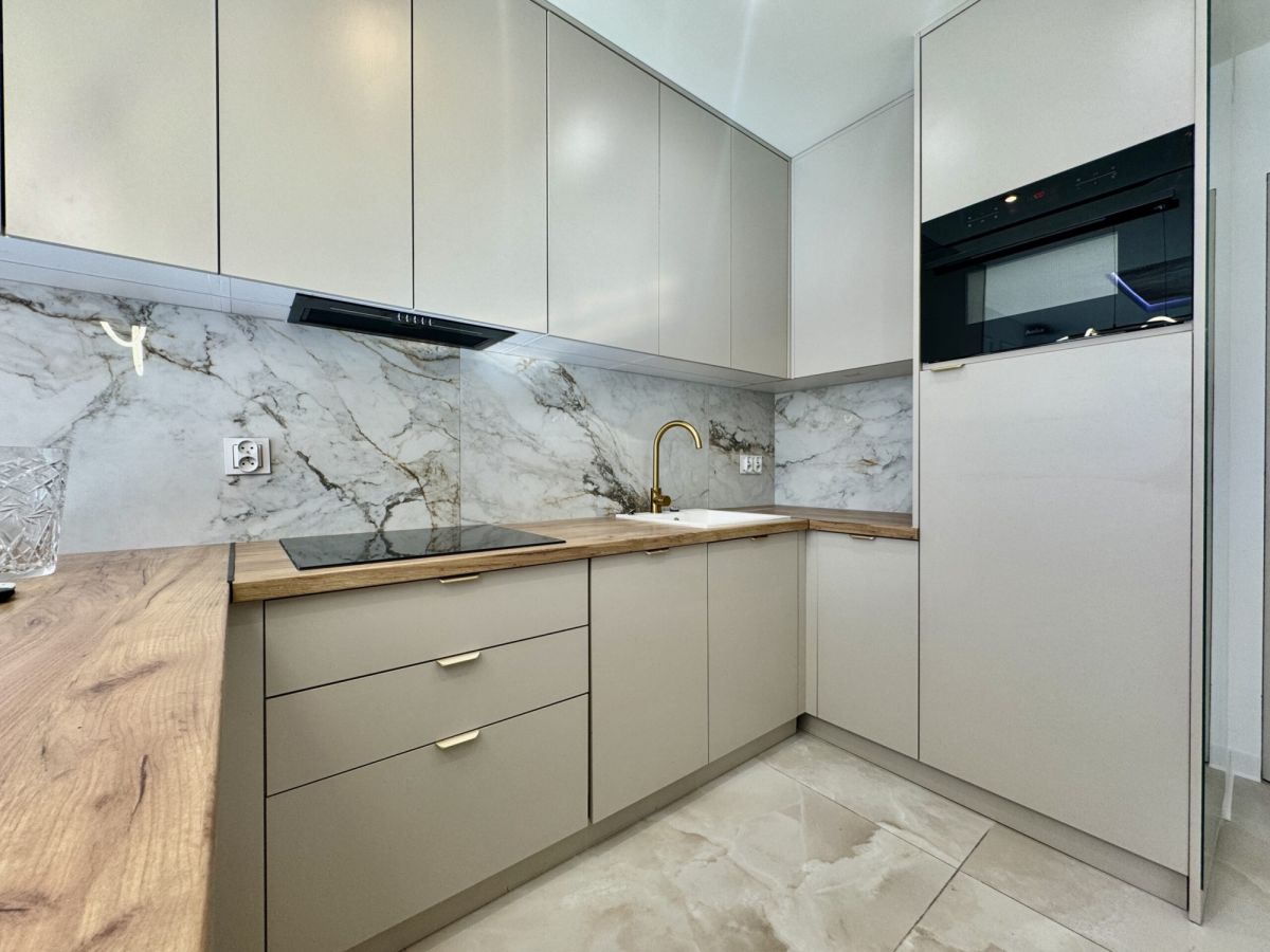 Kuchnia w zabudowie, w pełni wyposażona w sprzęt AGD (lodówka, zmywarka, piekarnik, płyta indukcyjna, okap)